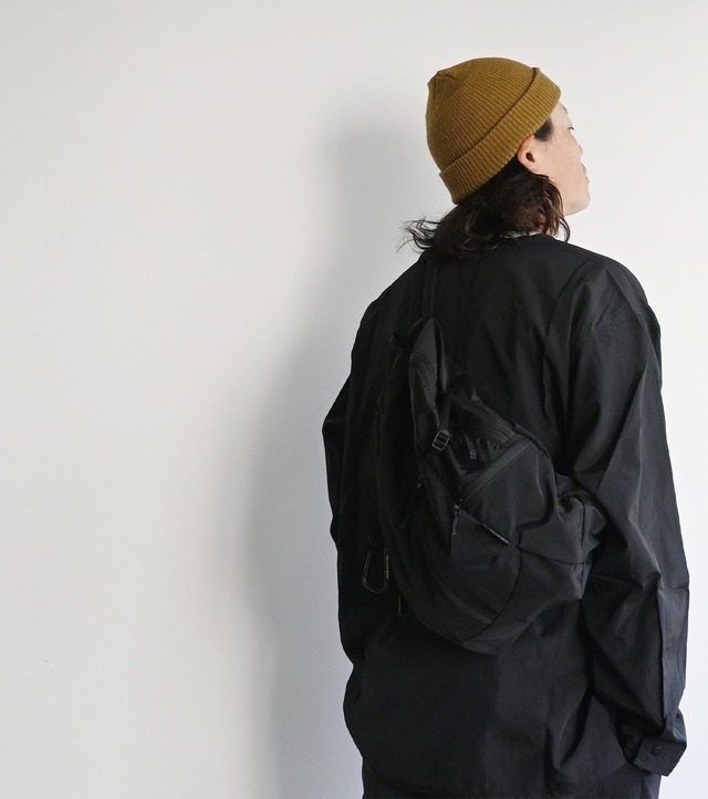軽量設計・構築的シルエットのスリングバッグ。 軽量ナイロンを使用し体に馴染むように構成された シンプルながらも立体感のあるフォルムが完成。 フロント中央には、内装に直接アクセスできるジッパーあり。 必要なものはクイックに取り出しが可能です。 両サイドにはジッパーポケットを備えており、 小物類を分けて収納可能。 バッグ内部をスッキリ整理できます。 メイン収納部分はほどよい容量があり、 デイリーに必要な荷物をしっかり収納可能。 さらに生地が柔らかい為、コンパクトにたたんで 旅行時には持ち運びやすく、大型パックのサブバッグとしても 使い勝手が良いアイテムです。 ショルダーベルトは長さ調整可能。 さらにワンタッチで着脱可能なアタッチメントパーツを使用。 軽量設計の為、長時間の使用でも負担が少なく、 旅行やデイリーシーン、アクティブなシーンにも信頼できるショルダーです。 生地は、表面にナチュラルなワッシャー加工を施した[#01YBK] リップストップクロスを使用した[#03YLBK]展開です。 ●本体内装:メッシュポケット×1 ●本体内装:オープンポケット×1 ●外装:ジッパーポケット×2 ●内装:コードストラップ付 ●カラビナ×1 ●ワンタッチで着脱できるアタッチメント ■color:BLACK(生地違い) 01-Y BLACK 03-YL BLACK(リップストップクロス) ~リップストップクロス(リップストップ生地)~ 高強度で太い糸を格子状に織り込み、生地の引き裂き(rip)を防ぐ(stop)ことを目的とした丈夫で、軽量性・耐久性を両立させた生地です。 ■サイズ:H45cm×W36cm×D15cm ■weight:約230g ■volume:約24L ■生産国:CHINA ■素材 : ナイロン ~GRS商品(Global Recycle Standard)~ 素材は回収された廃棄ペットボトルを原料とした繊維糸を使った生地となり、環境に配慮した持続可能な物作りを目指しています。 ~撥水加工生地~ 本製品には、撥水加工を施したナイロン生地を使用しています。 生地表面に水滴を弾く加工を施すことで、日常生活における軽度の雨や水滴からバッグ内部を保護します。また、JIS L 1092 に準拠した撥水性試験を実施し、規定基準を満たす性能を確認済みです。これにより、一定の耐水性と防汚性を兼ね備え、実用性と信頼性を兼ね備えた仕様となっています。※本製品は撥水仕様であり防水仕様ではありません。長時間の降雨や強い水圧下での使用はご注意ください。 【商品について】 ※サイズは外寸です。手作業での採寸の為、記述寸法より若干の誤差が生じる場合がございます。 ※裁断によって模様の配置が写真と異なる場合がございます。 ※商品画像と実物ではモニター及び画像性能等の関係で多少色味が異なって見える可能性がございます。予めご了承ください。 ※過剰な摩擦や湿った状態でご使用されますと他の衣類への色移りや色落ちする場合があります。