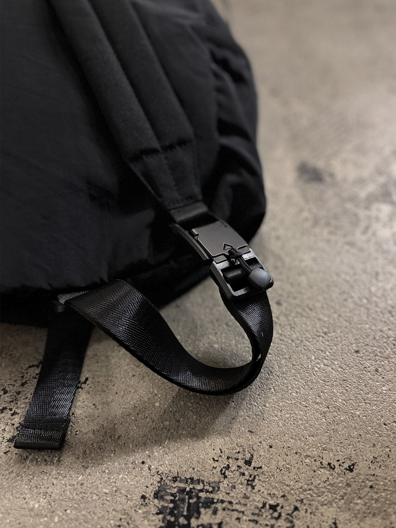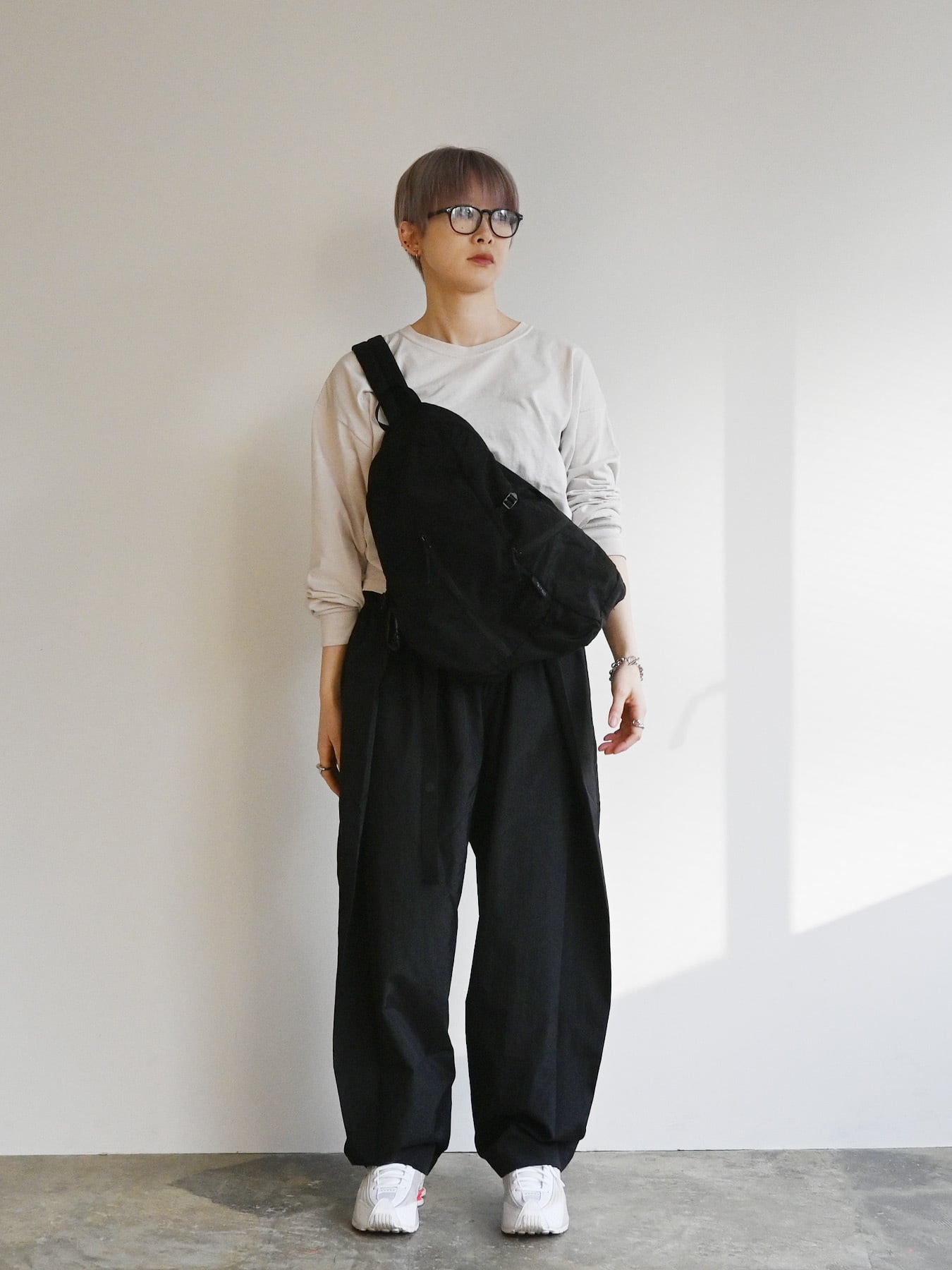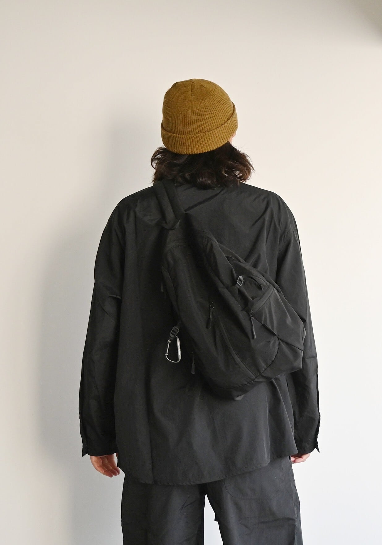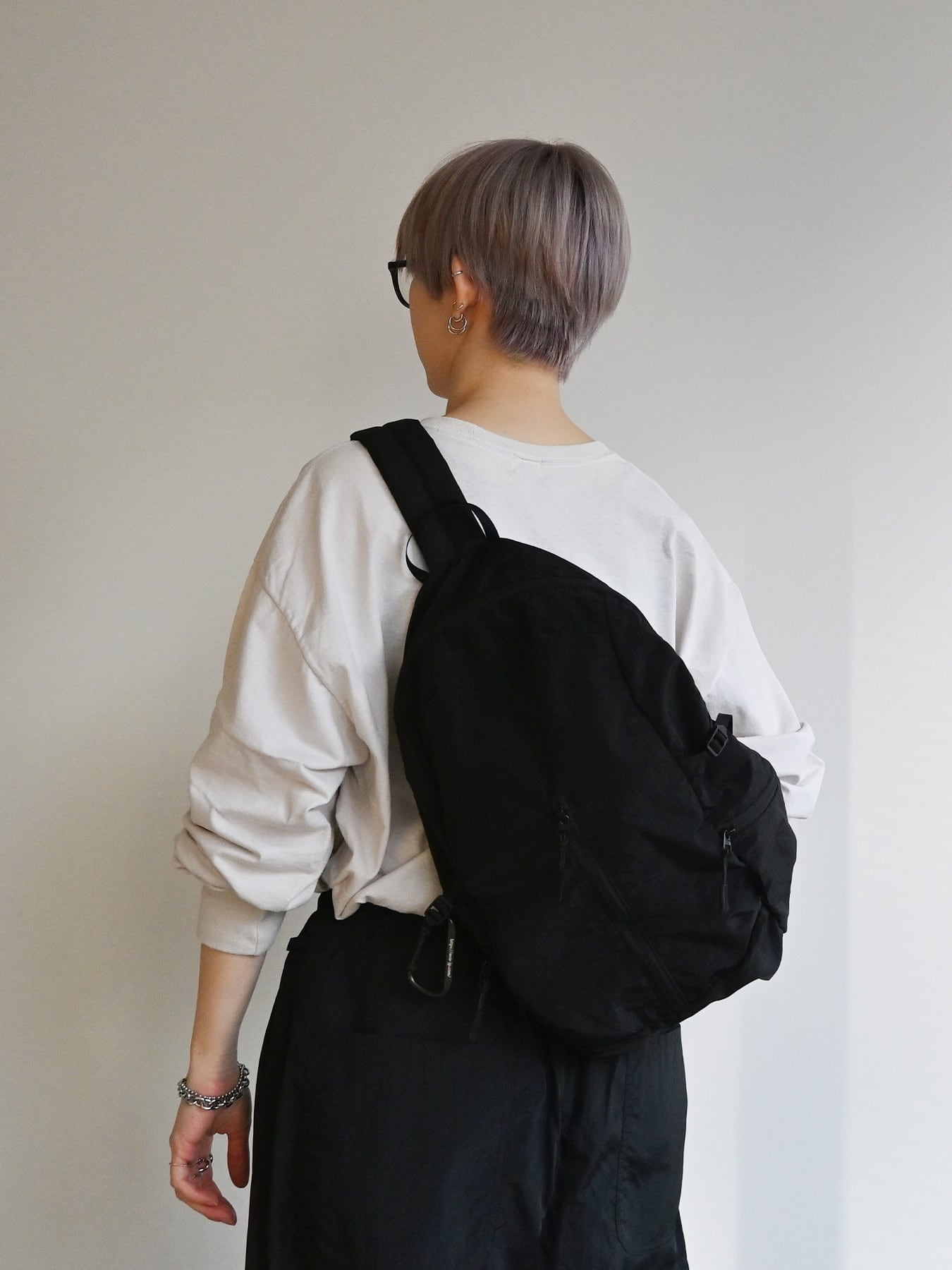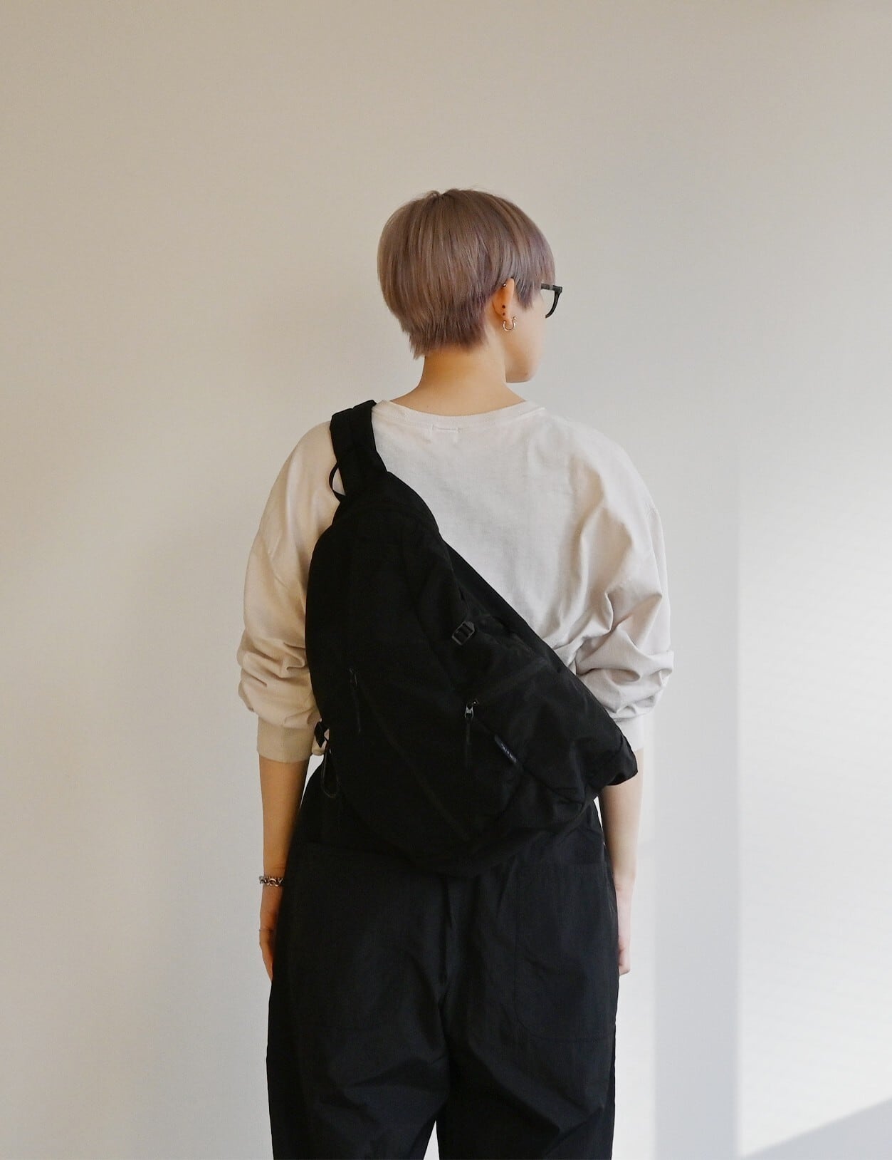 軽量設計・構築的シルエットのスリングバッグ。