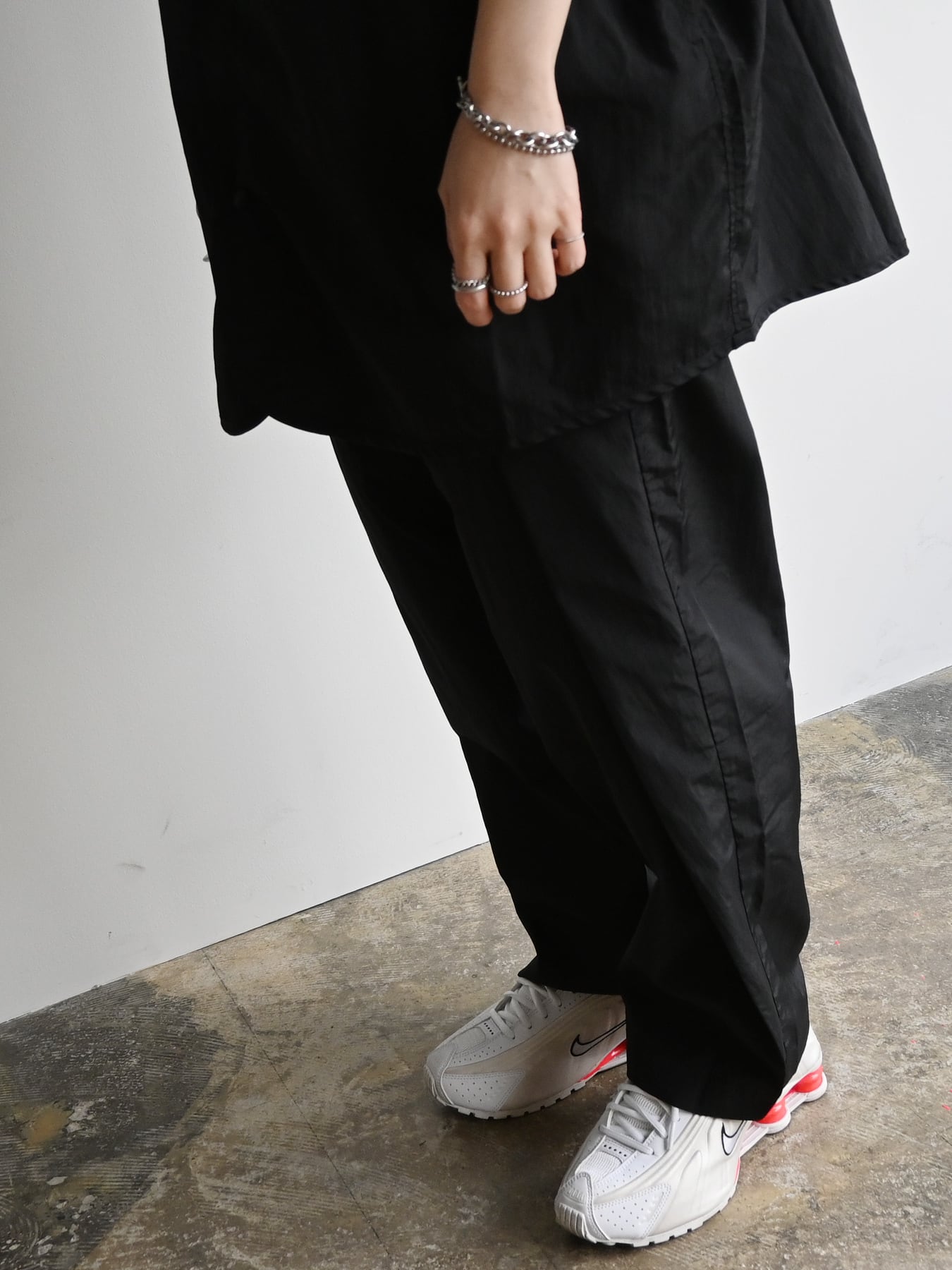 軽やかな穿き心地が魅力のブラックワイドパンツ。